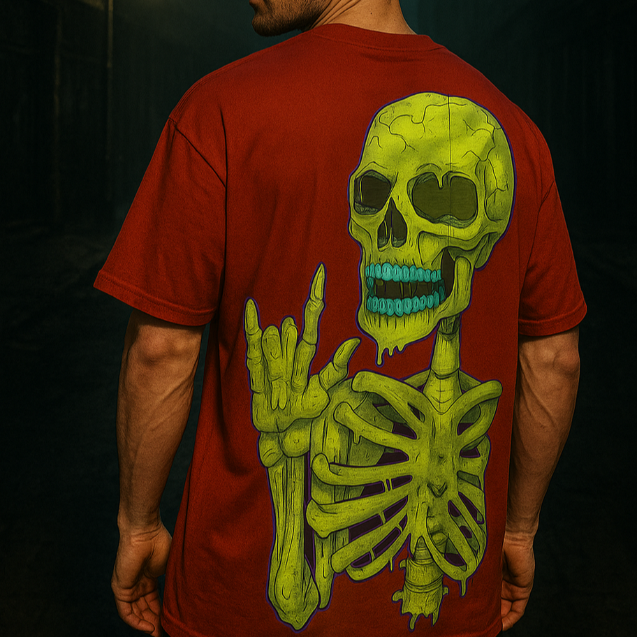 This oversized T-shirt features the bold phrase "BE TOXIC" on the front, paired with a striking skeleton graphic on the back. Designed for those who embrace edgy, rebellious style, it offers a relaxed fit and soft, comfortable fabric. Perfect for making a daring statement from every angle.