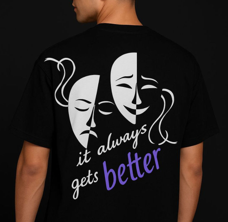 This oversized t-shirt blends bold style with meaningful art. Featuring a powerful “It Always Gets Better” design on the back and a detailed masquerade mask motif on the front pocket, it symbolizes strength, hope, and individuality. Perfect for those who wear positivity and creativity with confidence.